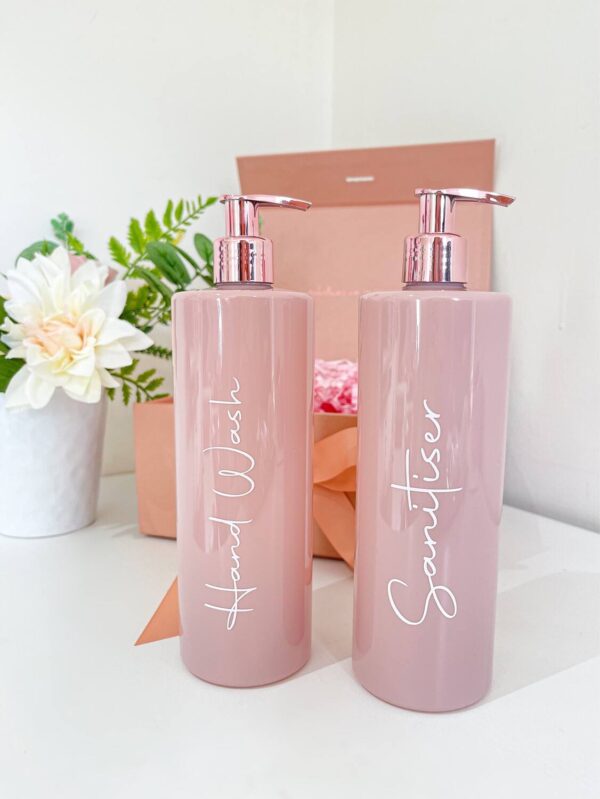Pump bottles are 500ml and available in white with white and silver pump or pink with rose gold pump.