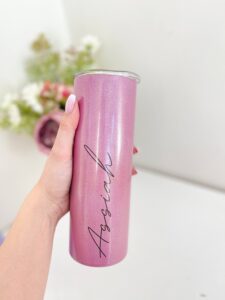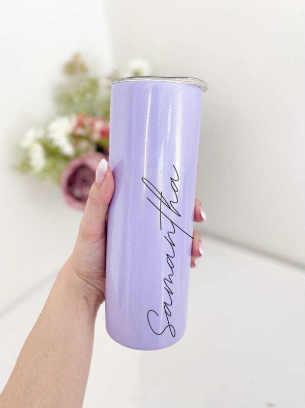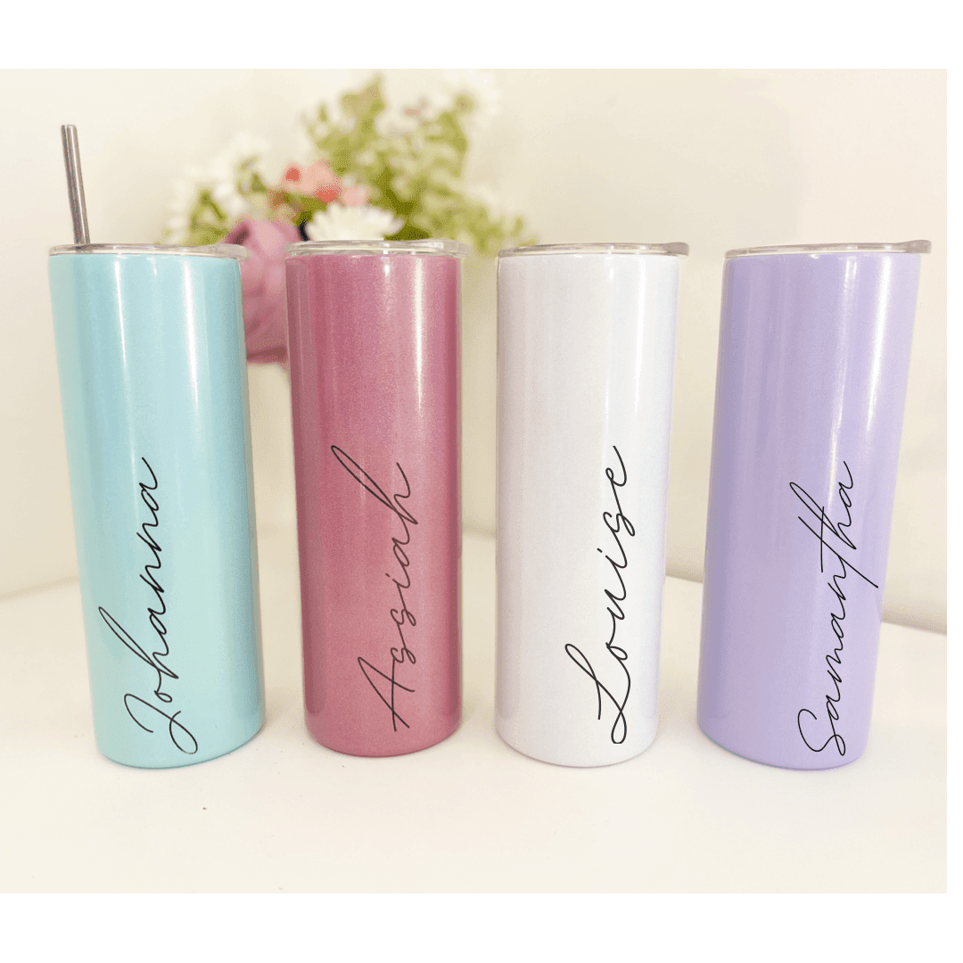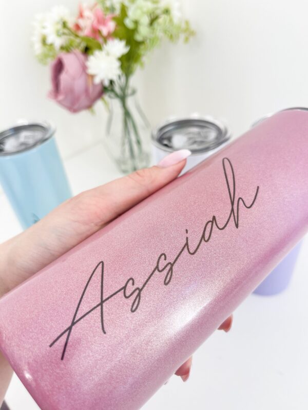 Personalised name is heat pressed onto the tumbler making it hard-wearing